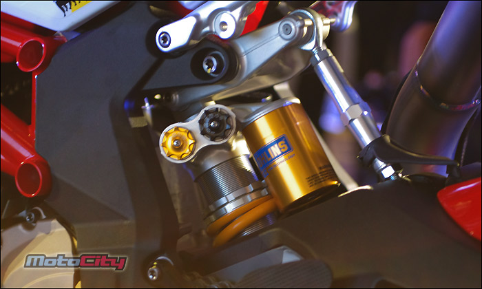前懸吊系統使用Ohlins倒立式前叉 制動系統採用Brembo M50鑄造對四卡鉗搭配320mm浮動碟