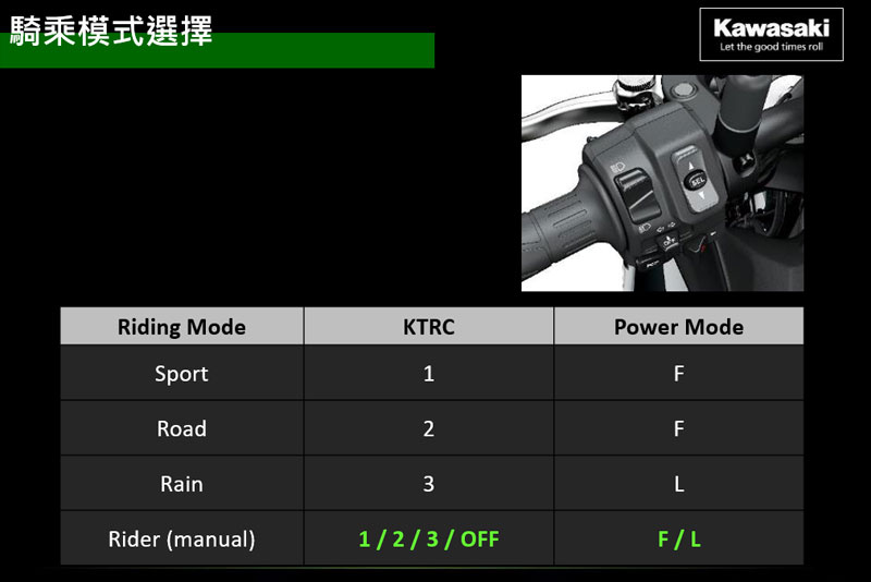L可用於新手或是路面濕滑時使用. 以上電控設定都可在龍頭把手上一鍵切換.