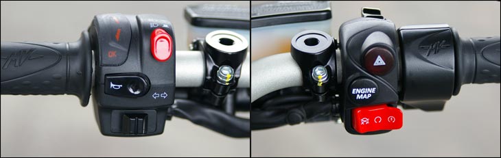 右邊把手配置警示燈按鍵.MAP選擇鍵.紅色按鍵為引擎開關及啟動鍵