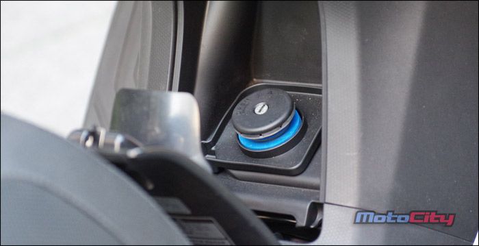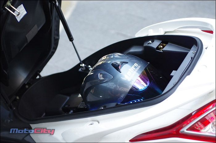 車廂開啟有氣壓桿支撐椅墊的設計.車廂置物空間可存放兩頂全罩式安全帽. 環島時的輕便行李不用擔心無處放置