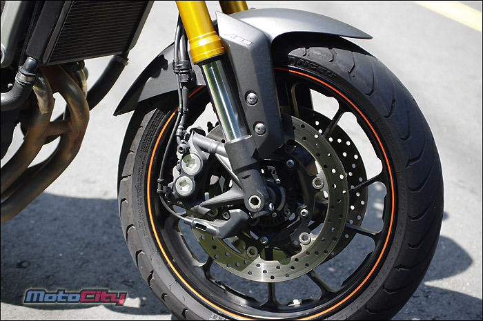 但如果是沒有ABS的版本.則要稍微做前後煞車分配的練習.以發揮MT-09最安全 與優異的煞車效能.
