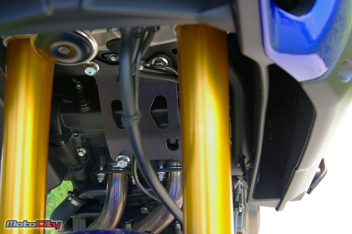 不同於一般跑車.街車的油(水)冷排放置於油桶下方的設計.為防止行駛於砂石地