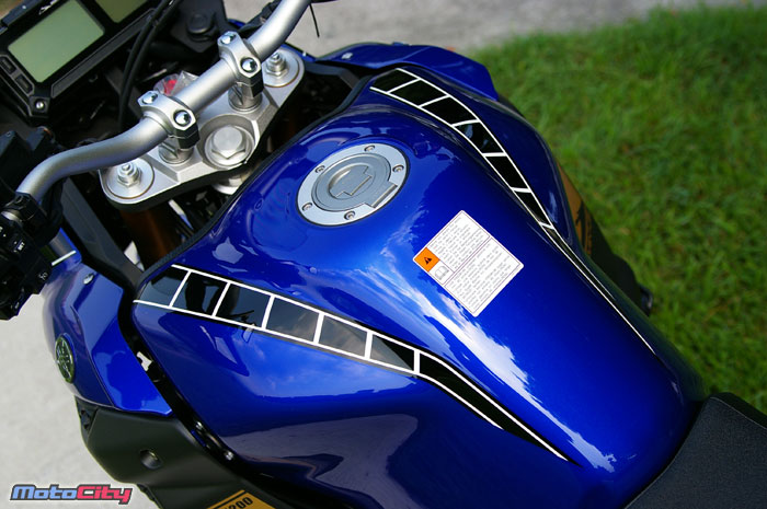 23公升的大油箱讓XT有更多的能量去探險.前寬闊後窄收的油桶設計可讓騎士 有自然的夾腳姿勢