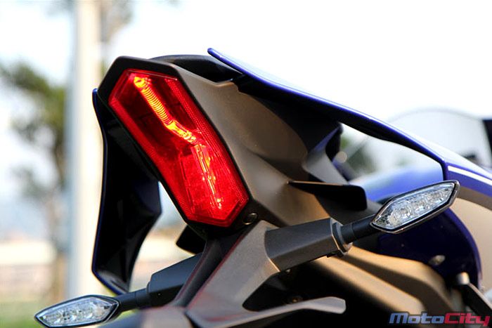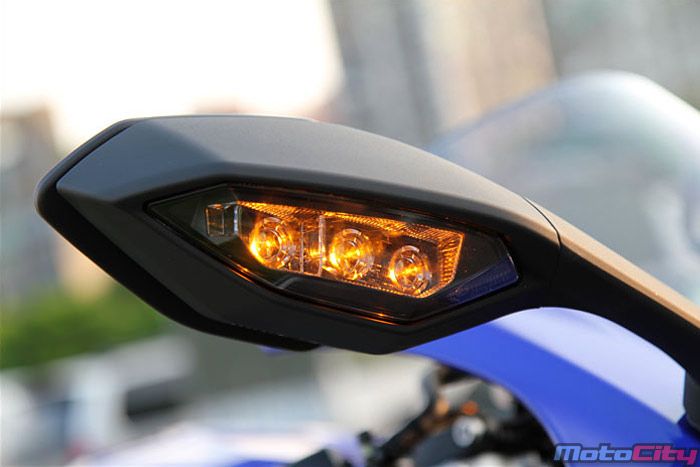 照後鏡與方向燈整合在一起.Yamaha是首度在跑車上運用這樣的設計 一體成型讓新R1看來更有質感