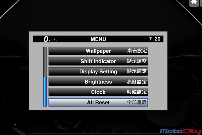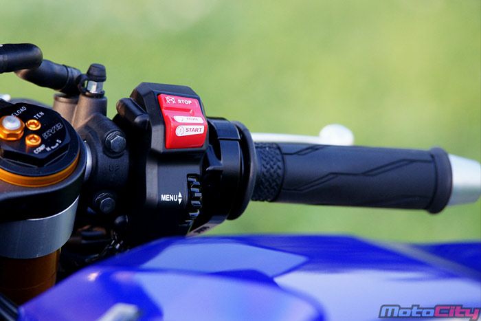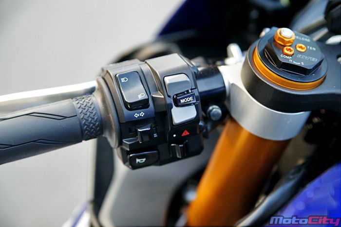 前方有Lap單圈計時開關 後方則有遠近燈開關、方向燈開關、MOGE切換開關以及喇叭和警示燈開關