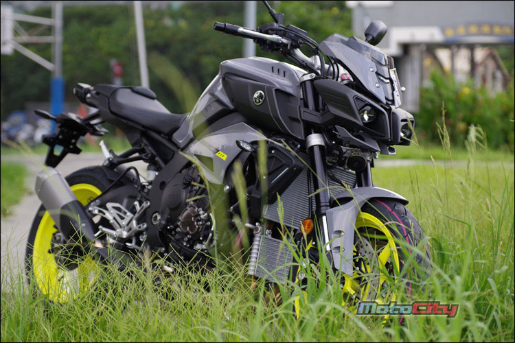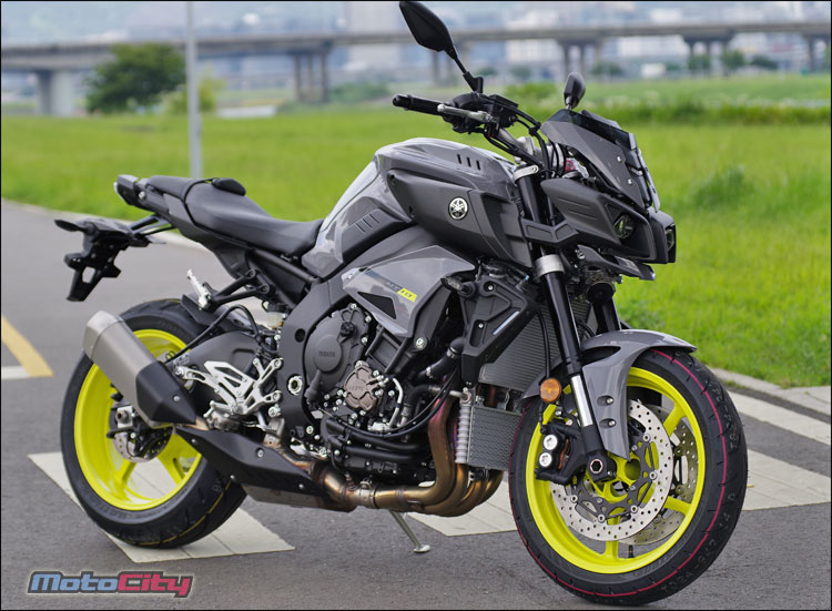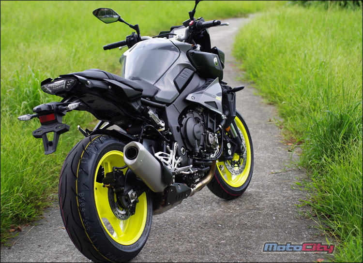 螢光黃的17吋五爪鋁合金輪圈.讓MT-10在黑夜行駛中非常亮眼奪目.