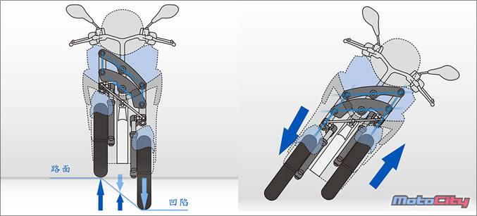 前輪兩個輪胎以單邊雙避震的配置.讓前輪兩輪間距縮近.車頭寬度更趨近一般二輪車