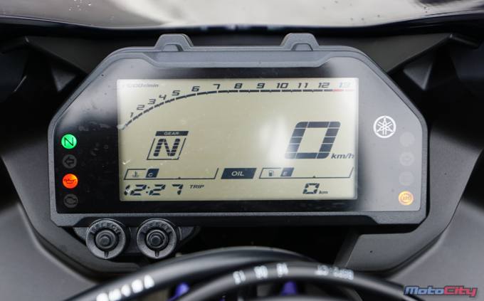 新式的儀表板其造型與YZF-R1很相似.採用高反差液晶螢幕.配有檔位顯示、 水溫、油量以及時間顯示功能.還配備可調式換檔時機指示燈.可設定引擎轉速、