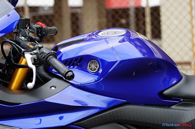 新型的油箱.為配合把手的高度也下降的20mm.寬度增加31.4mm 讓騎士做趴車動作時.更能人車一體.另外在造型上也承襲的YZF-R1的散熱鰭片設計