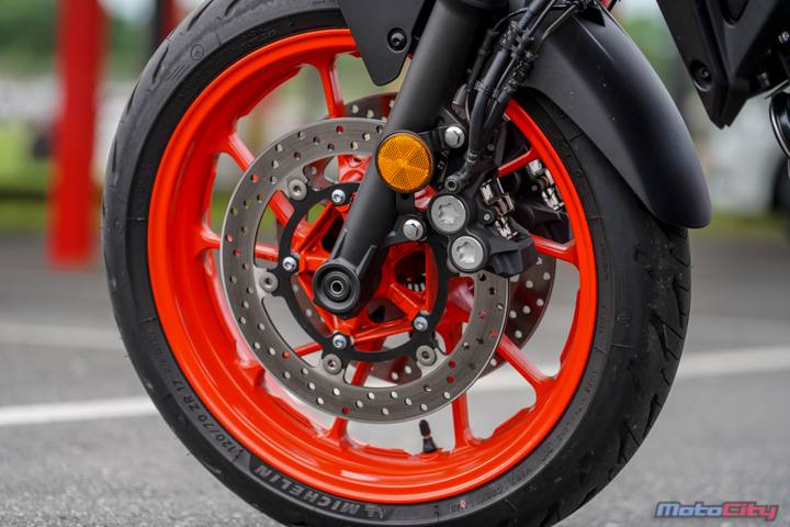 前制動改為298mm雙鑄鐵碟盤和雙子星對四卡鉗配置.並有ABS防鎖死剎車 功能.提供騎士更安心的制動效果