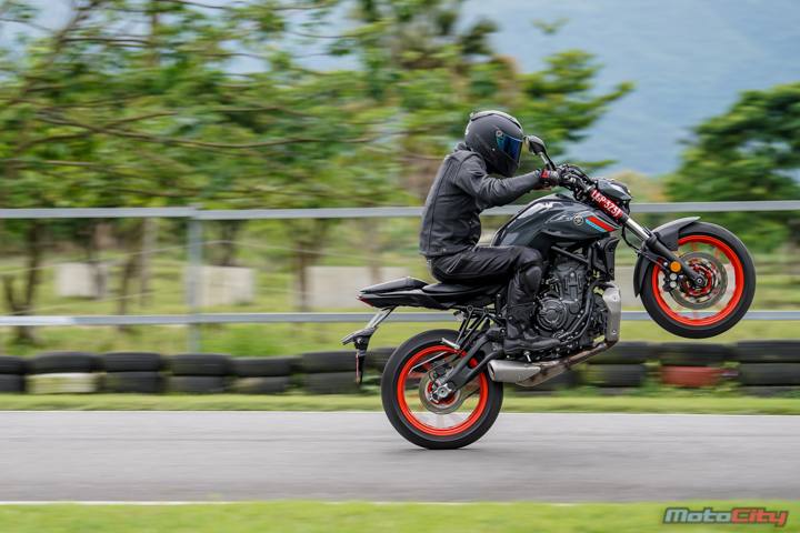 在封閉下的賽道上我們也嘗試使用MT-07的大扭力做孤輪的動作.MT-07 也能依照騎士需要給予瞬間全扭力的輸出.孤輪這類的動作也是輕而易舉