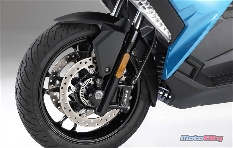 長達1565mm的軸距, 與普通摩托車類似的幾何形狀。前輪15”後輪14”,