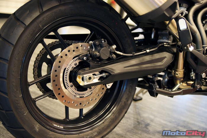 後剎車採用255mm單碟配上單活塞卡鉗 後輪採用17吋鋁合金輪圈.輪胎規格150/70ZR17